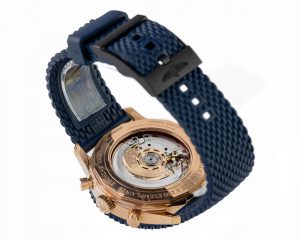 Obudowa: 46 mm, koperta z różowego złota 18K, obrotowy bezel z ceramiki, niebieska tarcza, szafirowe szkiełko, przezroczysty dekiel