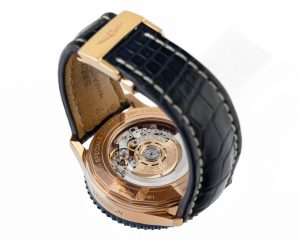 Numer referencyjny: RB046116/C972 – limitowana do 250 szt.Mechanizm: automatyczny, cal. Breitling B04, 47 kamieni łożyskujących, 70h rezerwy choduObudowa: 46 mm, koperta z różowego złota 18K, obrotowy bezel z ceramiki, niebieska tarcza, szafirowe szkiełko, przezroczysty dekielWodoszczelność: 10 ATMBransoleta/pasek: niebieska skóraZapięcie: pojedynczy zatrzask – różowe złoto 18KKomplikacje/funkcje: GMT – druga strefa czasowa, chronograf, mała sekunda, data, chronometrRok produkcji: 2018Stan: bardzo dobryPłeć: zegarek męski/unisexZawartość dostawy: oryginalne pudełko, komplet dokumentów, firmowa faktura