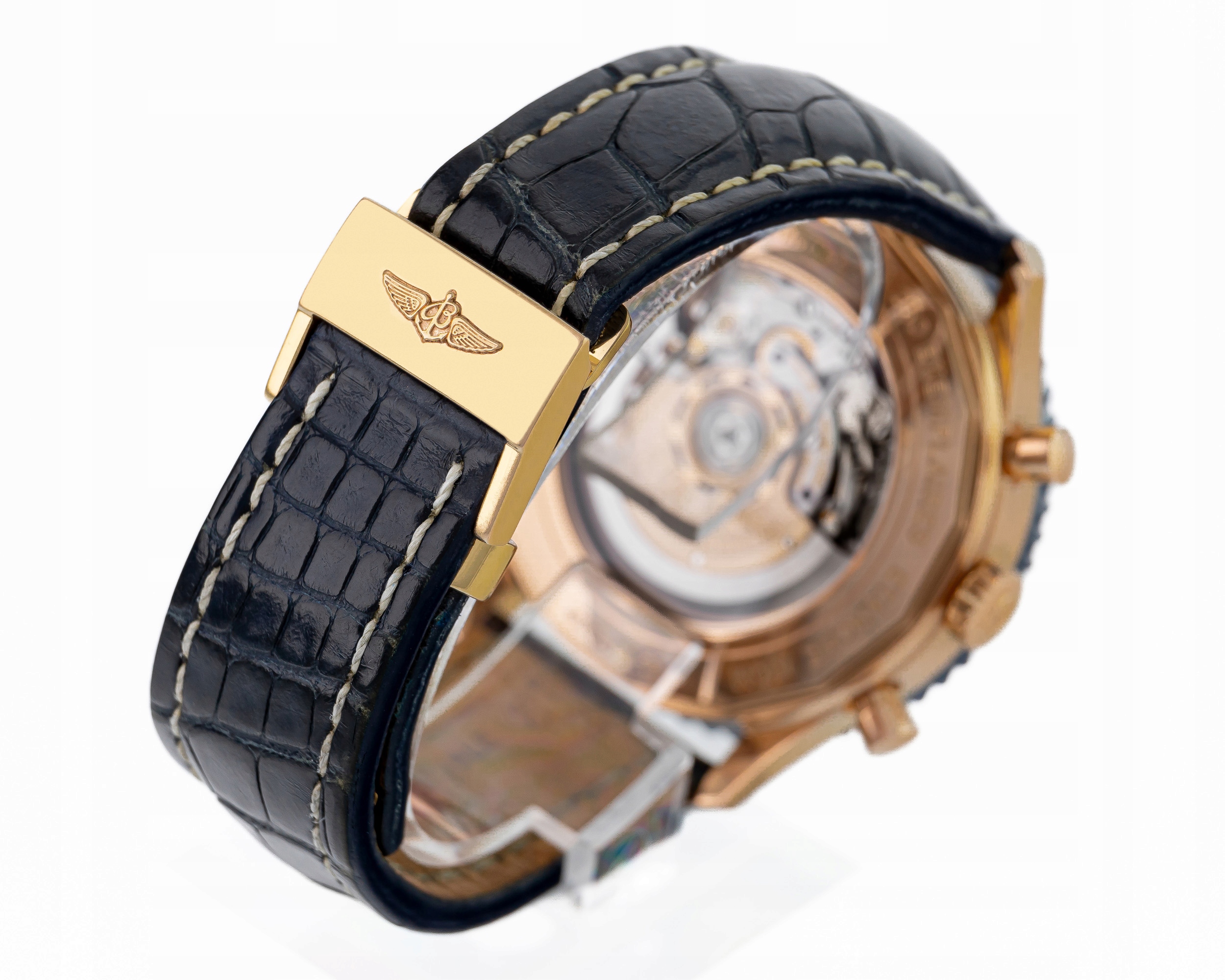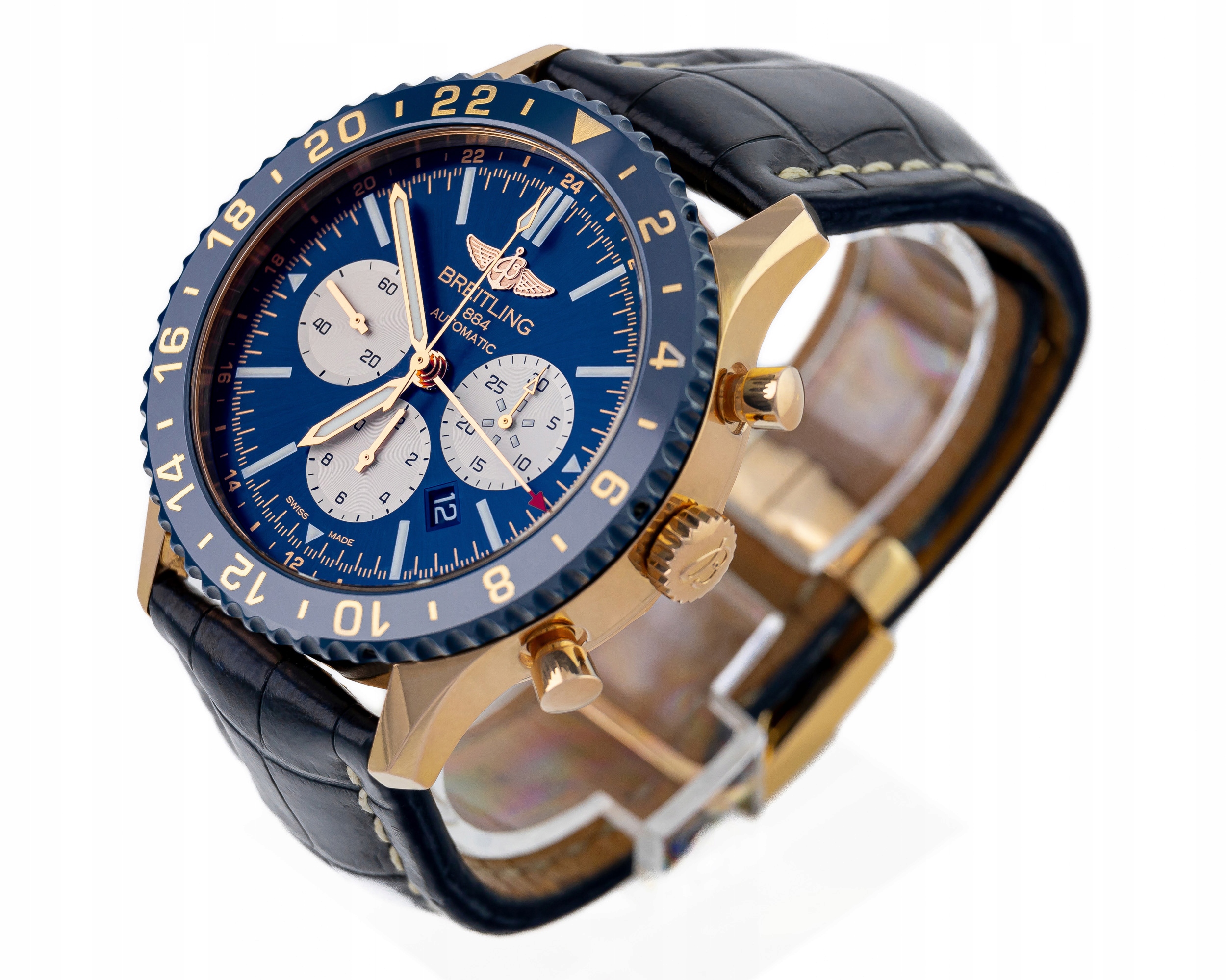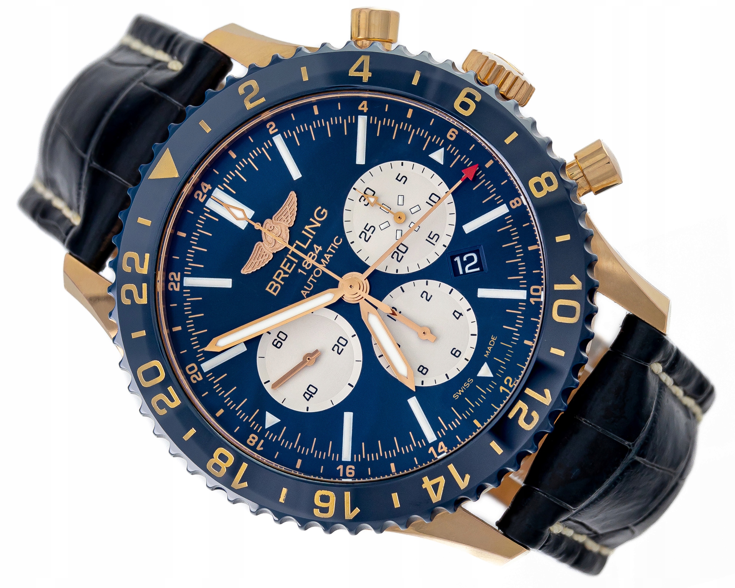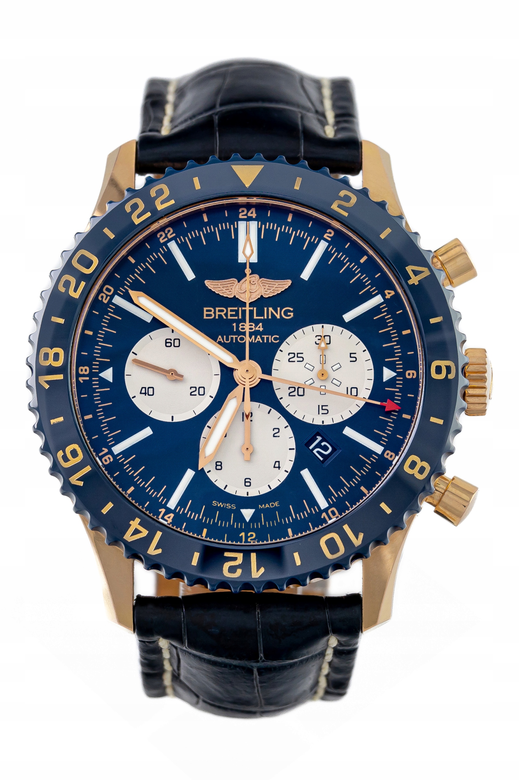 Numer referencyjny: RB046116/C972 – limitowana do 250 szt.Mechanizm: automatyczny, cal. Breitling B04, 47 kamieni łożyskujących, 70h rezerwy choduObudowa: 46 mm, koperta z różowego złota 18K, obrotowy bezel z ceramiki, niebieska tarcza, szafirowe szkiełko, przezroczysty dekielWodoszczelność: 10 ATMBransoleta/pasek: niebieska skóraZapięcie: pojedynczy zatrzask – różowe złoto 18KKomplikacje/funkcje: GMT – druga strefa czasowa, chronograf, mała sekunda, data, chronometrRok produkcji: 2018Stan: bardzo dobryPłeć: zegarek męski/unisexZawartość dostawy: oryginalne pudełko, komplet dokumentów, firmowa faktura