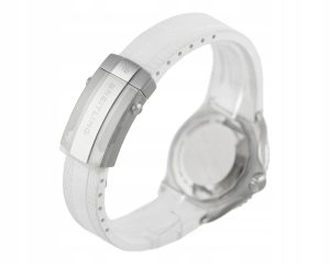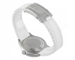 Obudowa: 36 mm, koperta ze stali, obrotowy bezel ze stali i ceramiki, biała tarcza, szafirowe szkiełko