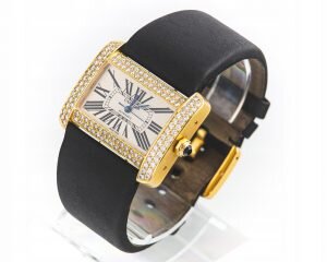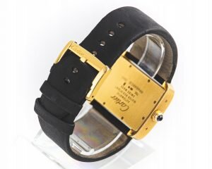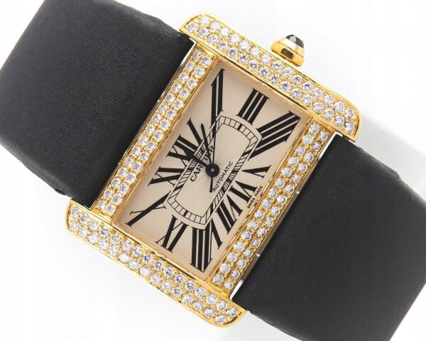 Luis Cartier zaprezentował model Tank pierwszy raz w 1917 roku. Dziś linia Tank jest legendą marki. Unikatowa estetyka, czyste, przejrzyste linie sprawiają, iż zegarek idealnie leży na dłoni. Koperta prezentowanego modelu wykonana została w całości z 18-sto karatowego żółtego złota i wysadzona najwyższej klasy diamentami. Tarcza w stylu retro wyśmienicie współgra z brązowym paskiem ze skóry krokodyla. Najwyższa klasa i elegancja od Cartier.