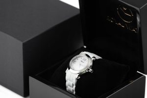 Obudowa: 36 mm, koperta i bezel ze stali, szafirowe szkiełko, tarcza zdobiona 3 pływającymi diamentami