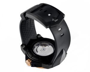 Obudowa: 48 mm, koperta z tytanu, bezel z różowego złota 18K, szafirowe szkiełko, przezroczysty dekiel