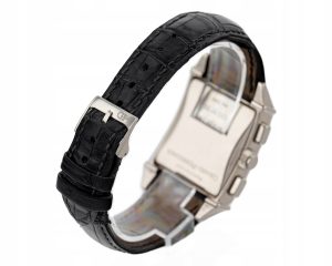 Pasek: czarna skóra, zapięcie klamrowe (białe złoto 18k)