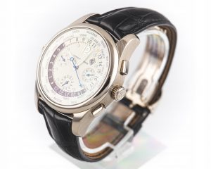 “World Wide Time Control” – obowiązkowy kompan ludzi dla których podróże są chlebem powszednim. Jeden z topowych modeli z serii “Traveller”- koperta i zapięcie w całości wykonane z 18-sto karatowego białego złota, precyzyjny chronograf, płynna korekta czasu w strefach czasowych. Zegarek łączy w sobie charakter eleganckiego dodatku oraz wygodę codziennego narzędzia.