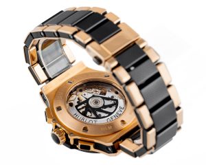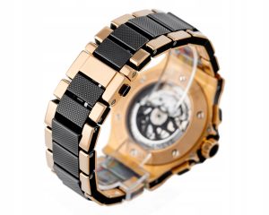 Obudowa: 44 mm, koperta z różowego złota 18K, bezel z ceramiki, czarna tarcza, szafirowe szkiełko, przezroczysty dekiel