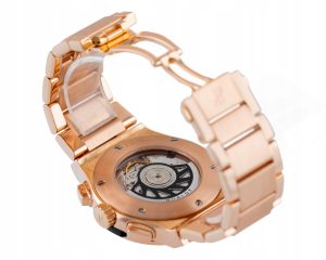 Obudowa: 42 mm, koperta i bezel z różowego złota 18K, opalowa tarcza, szafirowe szkiełko, przezroczysty dekiel
