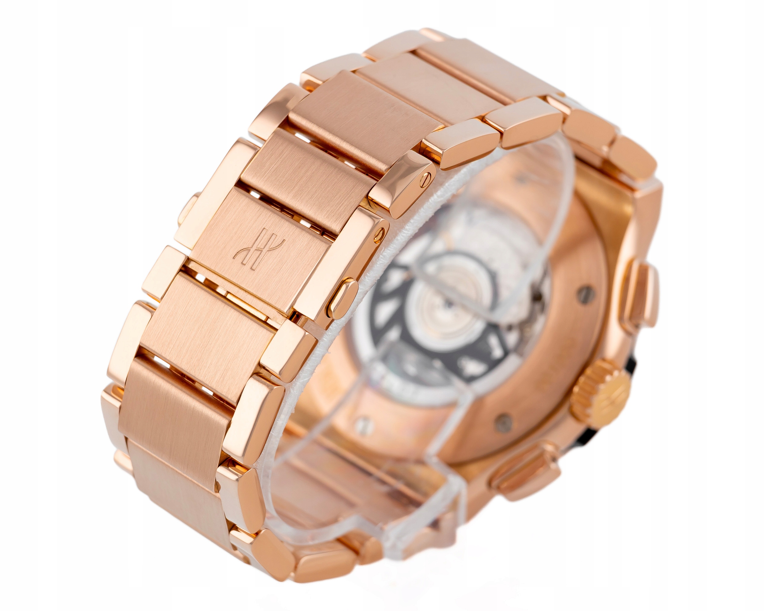 Obudowa: 42 mm, koperta i bezel z różowego złota 18K, opalowa tarcza, szafirowe szkiełko, przezroczysty dekiel