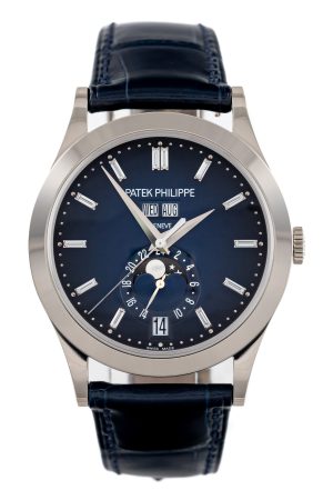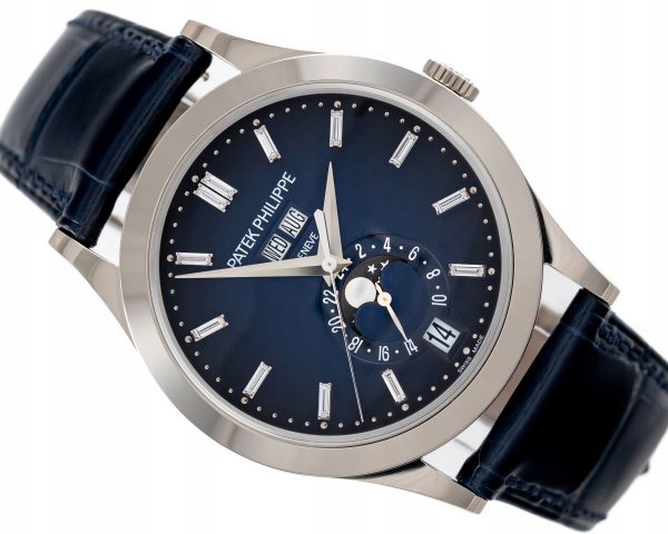 Przedmiotem sprzedaży jest przepiękny zegarek manufakturyPATEK PHILIPPE ANNUAL CALENDAR MOONPHASE WHITE GOLD 18K BLUE DIAMOND DIAL REF. 5396G-017 FULL SET UNWORN(zdjęcia autentyczne – przedstawiają sprzedawany egzemplarz)