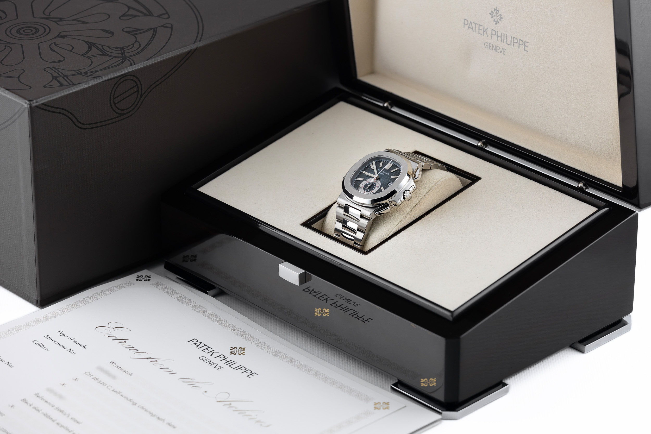 PATEK PHILIPPE NAUTILUS CHRONOGRAPH STEEL BLACK/BLUE DIAL REF. 5980/1 BOX+EXTRACT