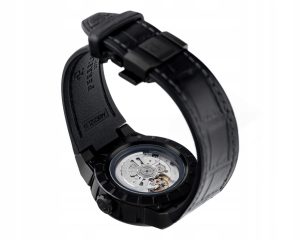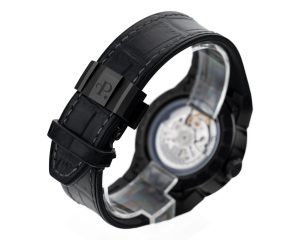 Obudowa: 44.5 mm, koperta ze stali pokrytej czarną powłoką PVD, niebieska tarcza, szafirowe szkiełko, przezroczysty dekiel
