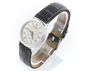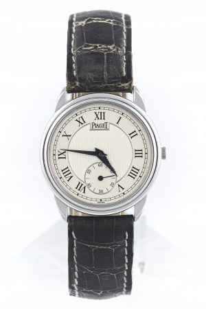 Referencja: 15968PTMechanizm: Manualny, cal. P1050Obudowa: platyna, 33,5mm, szafirowe szkiełko, wodoszczelność 3 ATMPasek: Czarna skóra, zapięcie klamrowe (platyna)Kondycja paska : dostatecznaKomplikacje/funkcje: mała sekundaZawartość dostawy: Oryginalne pudełko, komplet dokumentów, firmowa fakturaStan: dobryPłeć: Zegarek męski/UnisexCena producenta: –