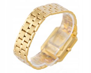 Obudowa: 25×28 mm, koperta z żółtego złota 18K, szafirowe szkiełko