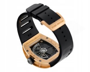 Obudowa: 38×45 mm, koperta z różowego złota 18K, przezroczysta tarcza, szafirowe szkiełko, przezroczysty dekiel