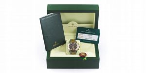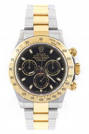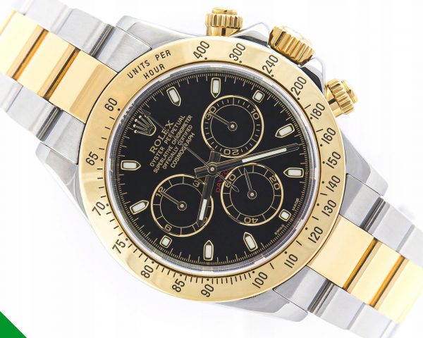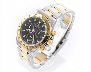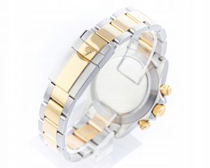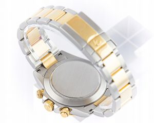 Cosmograph Daytona, pierwszy raz zaprezentowana w  1963 roku, zaprojektowano by sprostać wymaganiom profesjonalnych kierowców wyścigowych. Wraz ze swoim wiarygodnym chronografem i lunetą z miarą tachymetru, pozwala obliczać średnie prędkości do 400km na godzinę lub milę. Zegarek ten szybko stał się ikoną, której nikomu nie trzeba przedstawiać. Prezentowany model  wykonano z połączenia stali szlachetnej oraz złota 18k Rolesor. Zegarek wyposażony w mechanizm Calibre 4130 produkowany w całości przez manufakturę Rolex.
