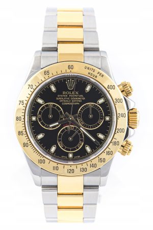 Cosmograph Daytona, pierwszy raz zaprezentowana w 1963 roku, zaprojektowano by sprostać wymaganiom profesjonalnych kierowców wyścigowych. Wraz ze swoim wiarygodnym chronografem i lunetą z miarą tachymetru, pozwala obliczać średnie prędkości do 400km na godzinę lub milę. Zegarek ten szybko stał się ikoną, której nikomu nie trzeba przedstawiać. Prezentowany model wykonano z połączenia stali szlachetnej oraz złota 18k Rolesor. Zegarek wyposażony w mechanizm Calibre 4130 produkowany w całości przez manufakturę Rolex.
