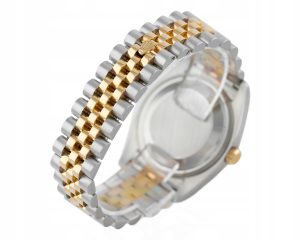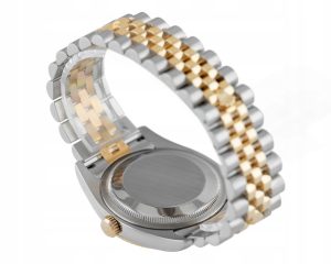 Obudowa: 36 mm, koperta ze stali, karbowany bezel z żółtego złota 18K, złota tarcza z diamentowymi indeksami, szafirowe szkiełko