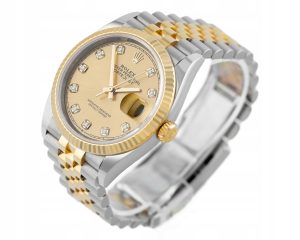 Obudowa: 36 mm, koperta ze stali, karbowany bezel z żółtego złota, złota tarcza z diamentowymi indeksami, szafirowe szkiełko