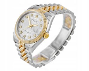 Numer referencyjny: 116233Mechanizm: automatyczny, cal. Rolex 3135, 31 kamieni łożyskujących, 48h rezerwy choduObudowa: 36 mm, koperta ze stali, karbowany bezel z żółtego złota 18K, srebrna tarcza z diamentowymi indeksami, szafirowe szkiełkoWodoszczelność: 10 ATMBransoleta/pasek: Jubilee – stal/żółte złoto 18KZapięcie: pojedynczy zakryty zatrzask – stal/żółte złoto 18KKomplikacje/funkcje: data, chronometrRok produkcji: 2005Stan: bardzo dobryPłeć: zegarek męski/unisexZawartość dostawy: oryginalne pudełko, komplet dokumentów, firmowa faktura