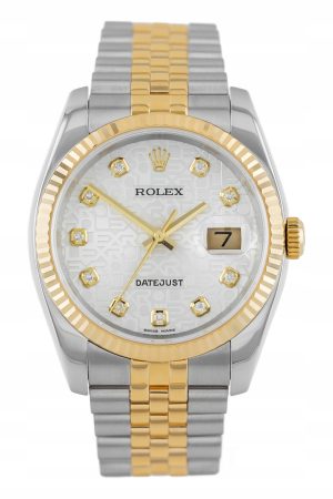Przedmiotem sprzedaży jest przepiękny zegarek manufakturyROLEX DATEJUST 36 JUBILEE STEEL/YELLOW GOLD 18K SILVER DIAMOND COMPUTER DIAL REF. 116233 FULL SET(zdjęcia autentyczne – przedstawiają sprzedawany egzemplarz)