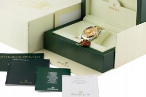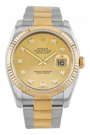 Numer referencyjny: 116233Mechanizm: automatyczny, cal. Rolex 3135, 31 kamieni łożyskujących, 48h rezerwy choduObudowa: 36 mm, koperta ze stali, karbowany bezel z żółtego złota 18K, złota tarcza z diamentowymi indeksami, szafirowe szkiełkoWodoszczelność: 10 ATMBransoleta/pasek: Oyster – stal/żółte złoto 18KZapięcie: pojedynczy zatrzask – stal/żółte złoto 18KKomplikacje/funkcje: data, chronometrRok produkcji: 2006Stan: bardzo dobryPłeć: zegarek męski/unisexZawartość dostawy: oryginalne pudełko, komplet dokumentów, firmowa faktura