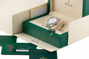 Numer referencyjny: 126300Mechanizm: automatyczny, cal. Rolex 3235, 31 kamieni łożyskujących, 70h rezerwy choduObudowa: 41 mm, koperta ze stali, bezel ze stali zdobiony diamentami, biała tarcza, szafirowe szkiełkoWodoszczelność: 10 ATMBransoleta/pasek: Jubilee – stal zdobiona diamentamiZapięcie: pojedynczy zatrzask – stal zdobiona diamentamiKomplikacje/funkcje: data, chronometrRok produkcji: 2022Stan: bardzo dobryPłeć: zegarek męski/unisexZawartość dostawy: oryginalne pudełko, komplet dokumentów, firmowa faktura
