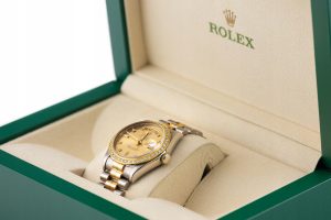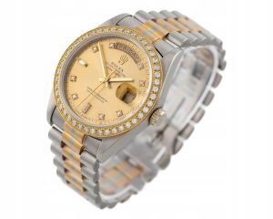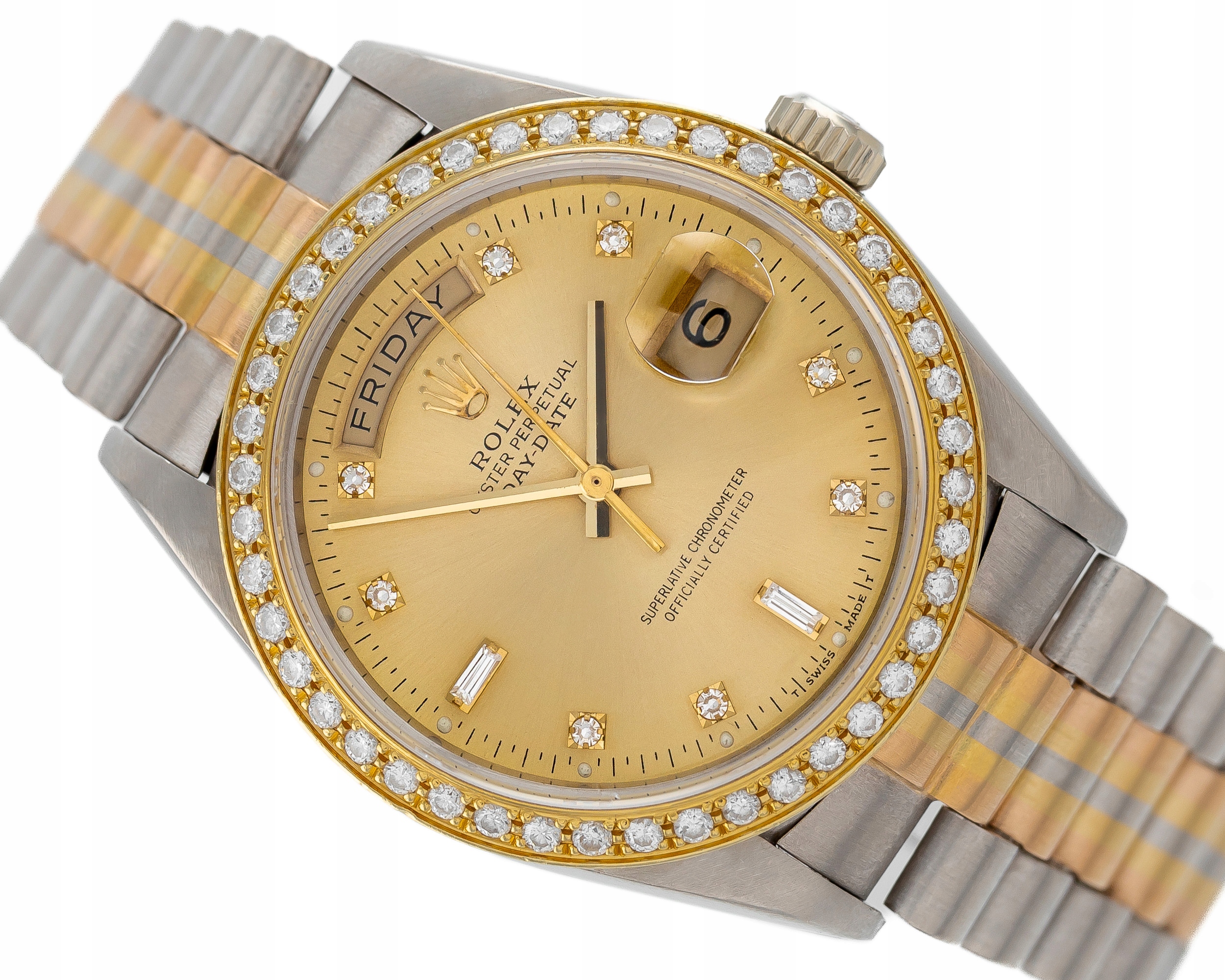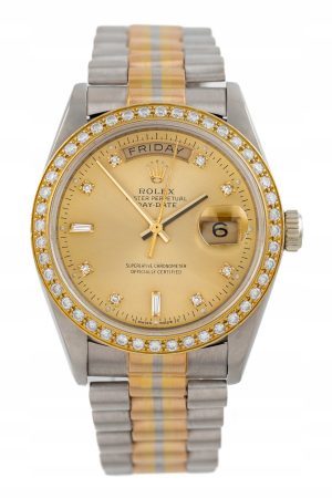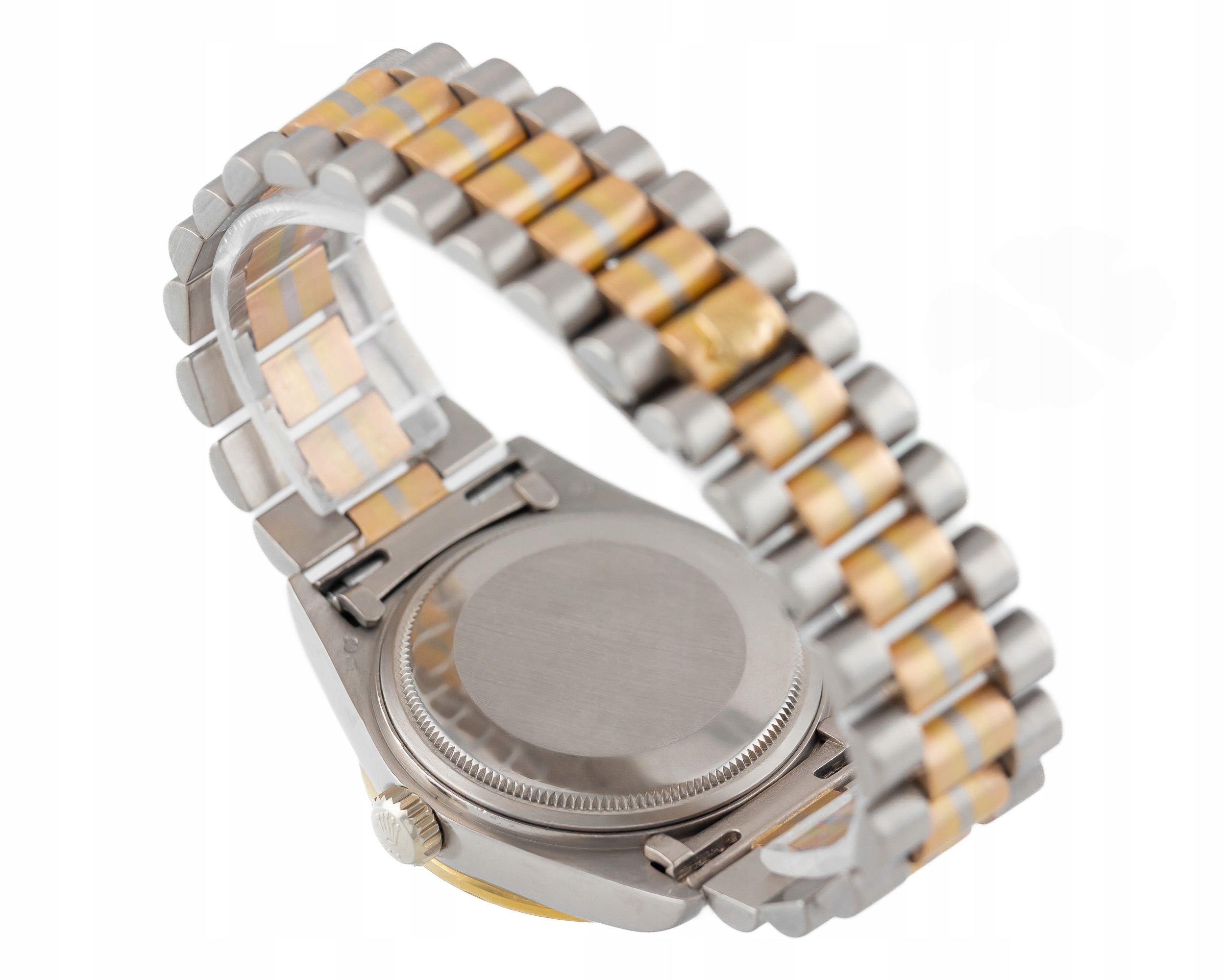 Przedmiotem sprzedaży jest przepiękny zegarek manufakturyROLEX DAY-DATE 36 TRIDOR PRESIDENT WHITE/YELLOW/ROSE GOLD 18K GOLD DIAMOND DIAL REF. 18039B(zdjęcia autentyczne – przedstawiają sprzedawany egzemplarz)