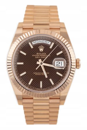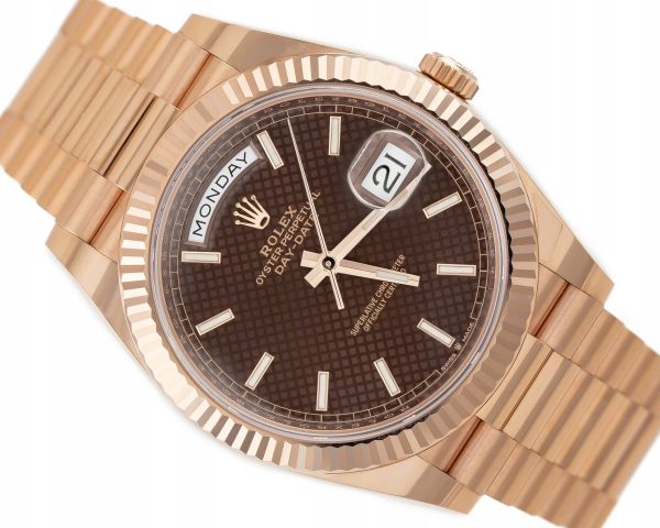 Royal Watch > Produkty > luksusowe zegarki > Męskie > ROLEX DAY-DATE 40 PRESIDENT ROSE GOLD 18K EVEROSE CHOCOLATE MOTIF BROWN DIAL REF. 228235 FULL SET