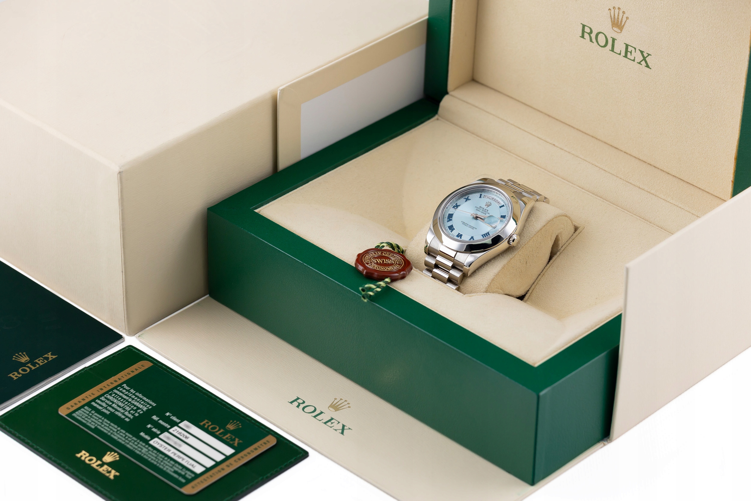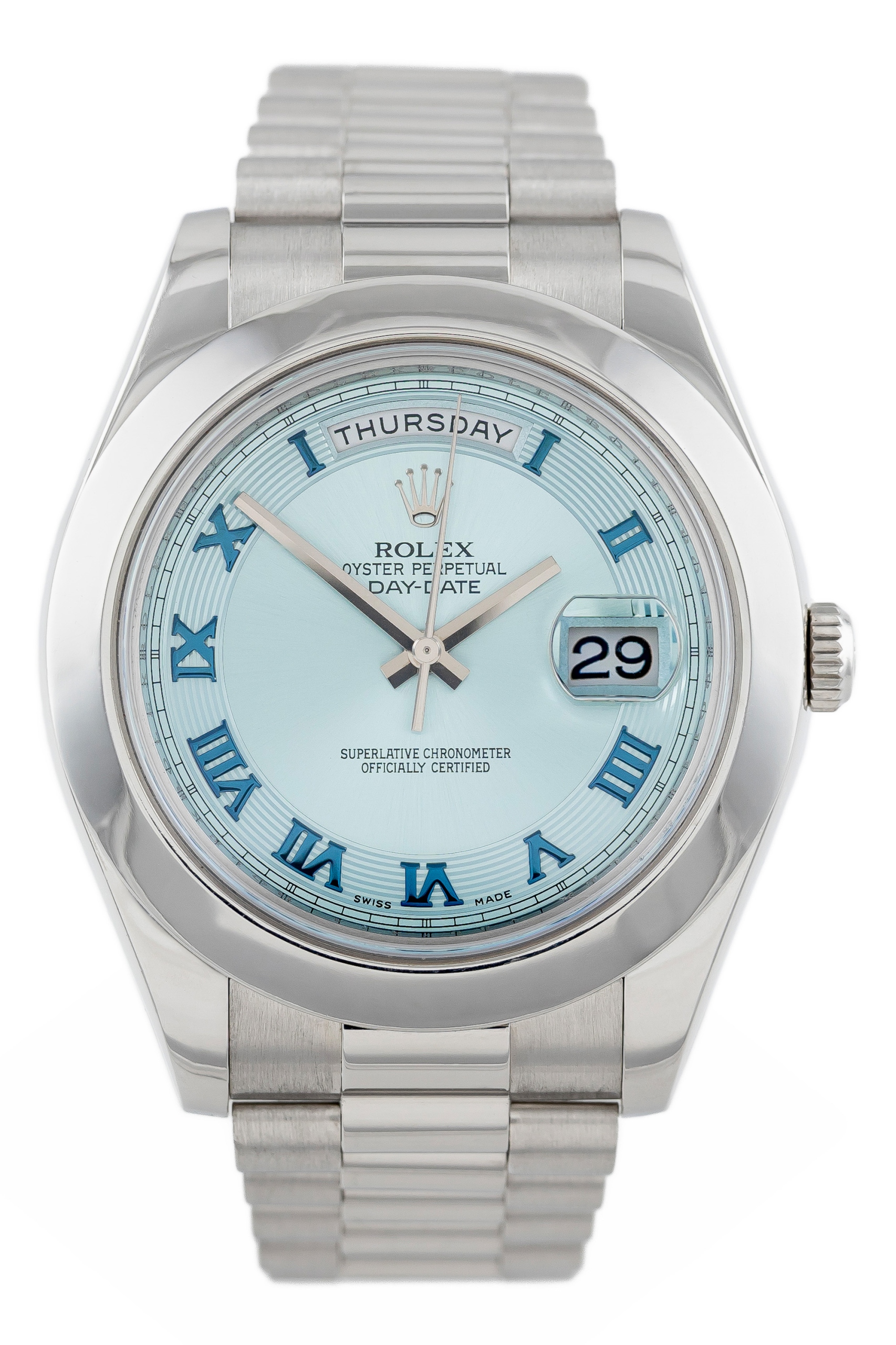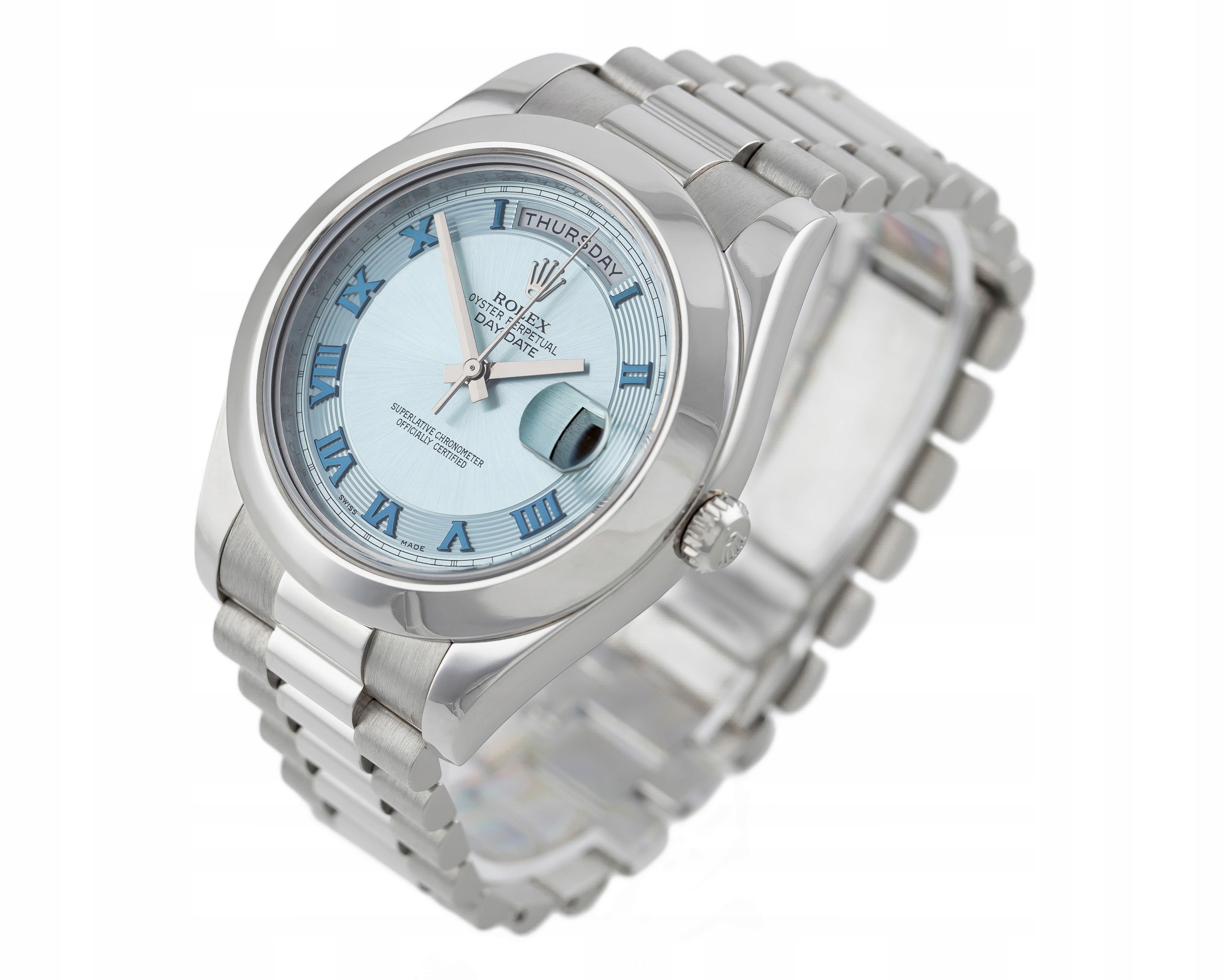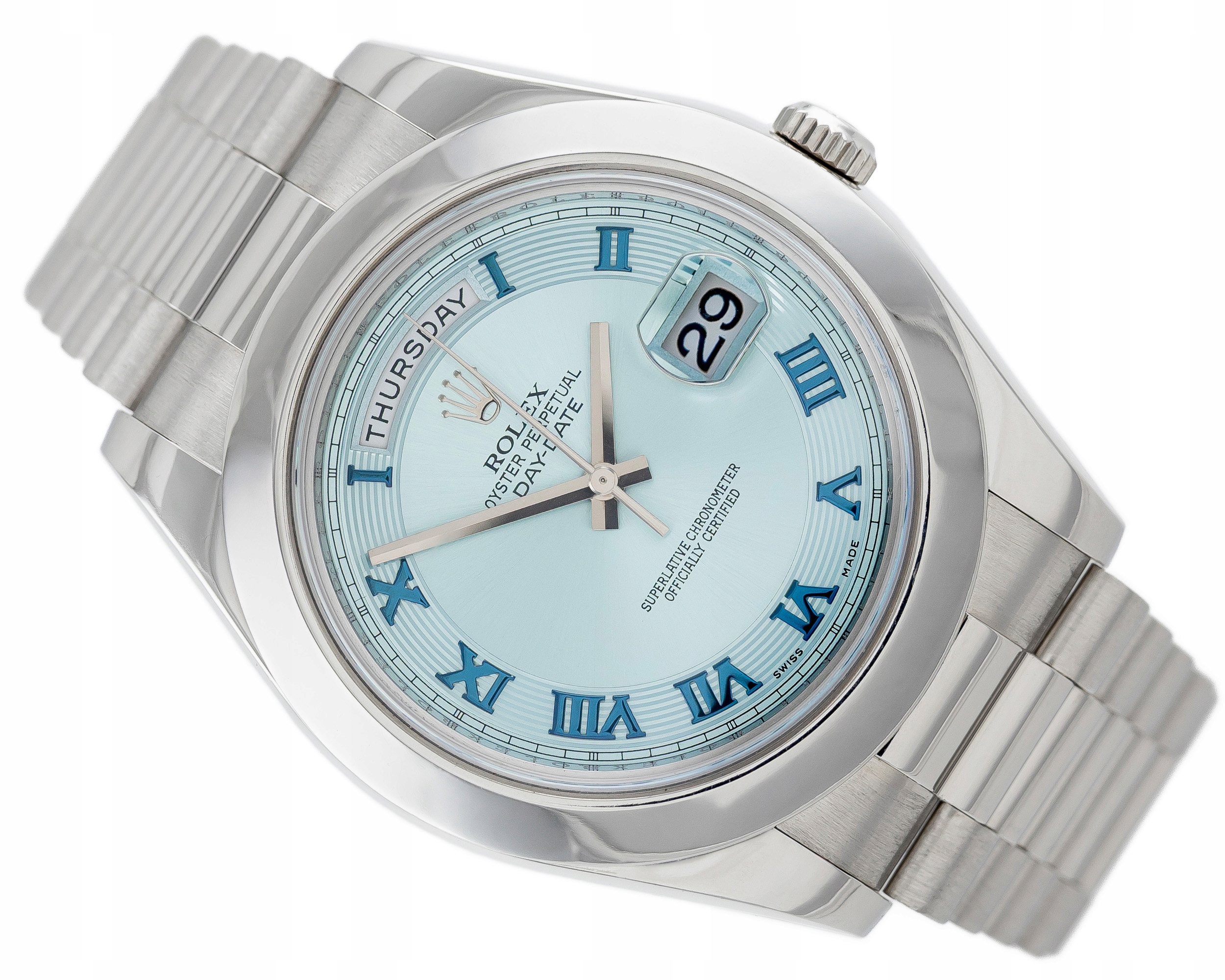 ROLEX DAY-DATE II 41 PRESIDENT PLATINUM 950 ICE BLUE ROMAN DIAL REF. 218206 FULL SET