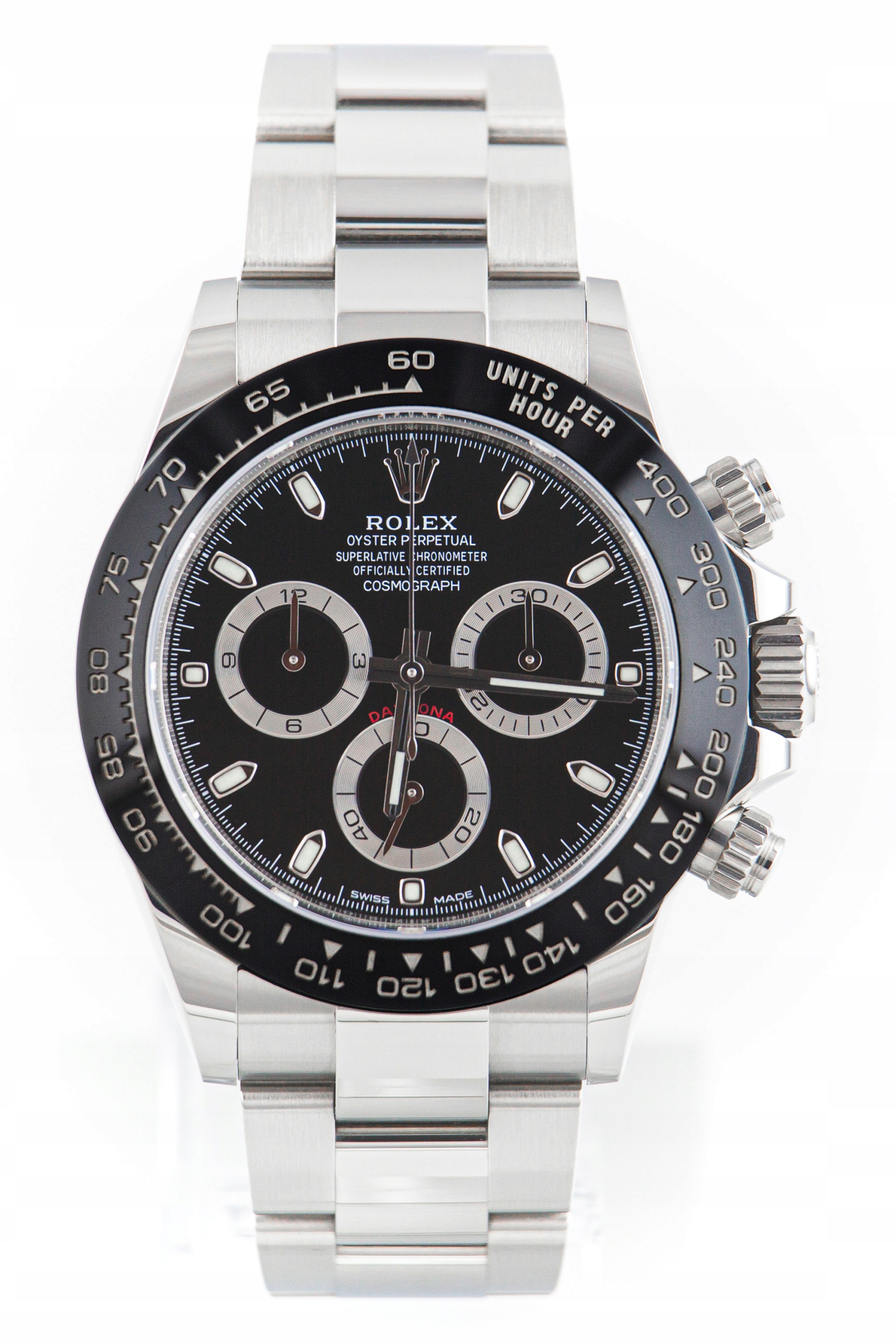 Przedmiotem sprzedaży jest przepiękny zegarek manufakturyROLEX DAYTONA COSMOGRAPH STEEL BLACK DIAL REF. 116500LN FULL SET(zdjęcia autentyczne – przedstawiają sprzedawany egzemplarz)