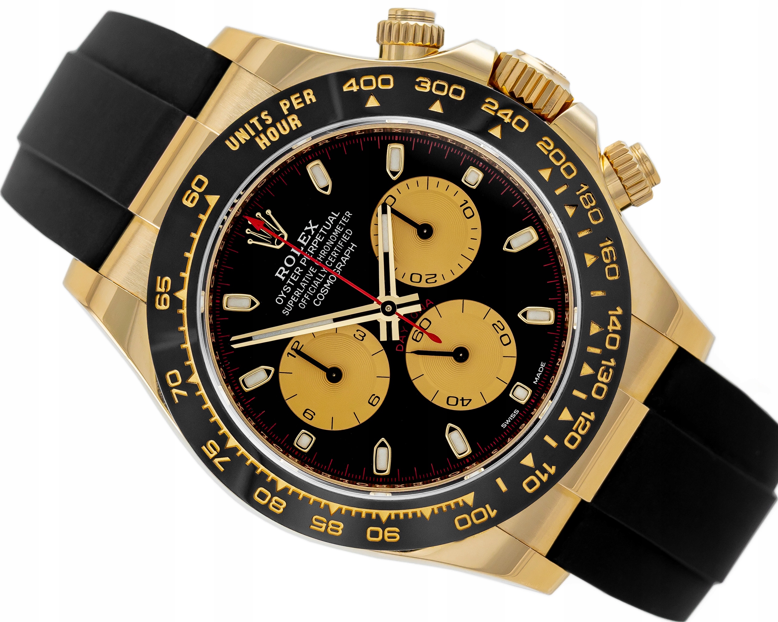 Numer referencyjny: 116518LNMechanizm: automatyczny, cal. Rolex 4130, 44 kamienie łożyskujące, 72h rezerwy choduObudowa: 40 mm, koperta z żółtego złota 18K, bezel z ceramiki, czarna tarcza, szafirowe szkiełkoWodoszczelność: 10 ATMBransoleta/pasek: Oysterflex – czarny kauczukZapięcie: pojedynczy zatrzask – żółte złoto 18KKomplikacje/funkcje: chronograf, mała sekunda, tachymetr, chronometrRok produkcji: 2021Stan: bardzo dobryPłeć: zegarek męski/unisexZawartość dostawy: oryginalne pudełko, komplet dokumentów, firmowa faktura