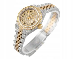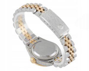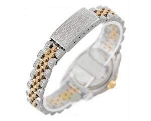 Obudowa: 26 mm, koperta ze stali zdobiona diamentami, bezel z żółtego złota 18K zdobiony diamentami, szafirowe szkiełko, złota tarcza zdobiona diamentami
