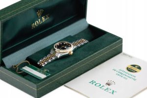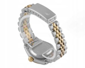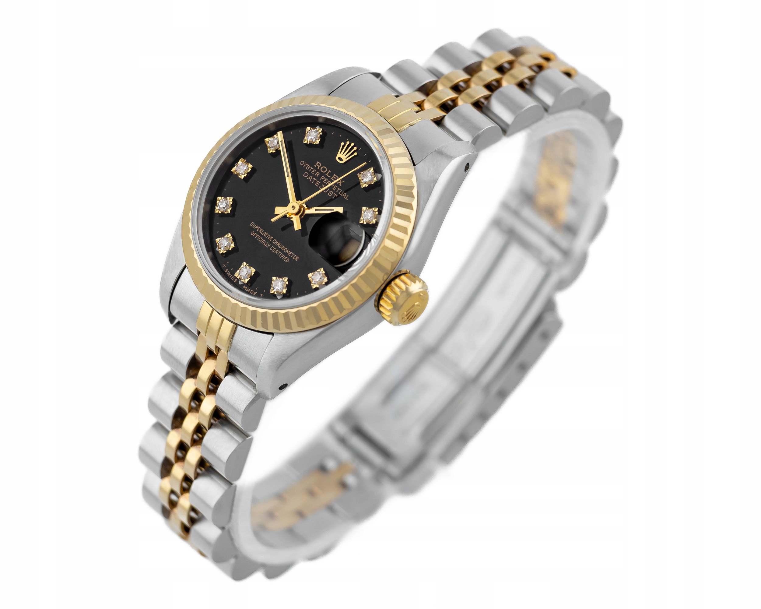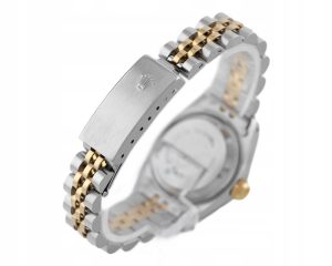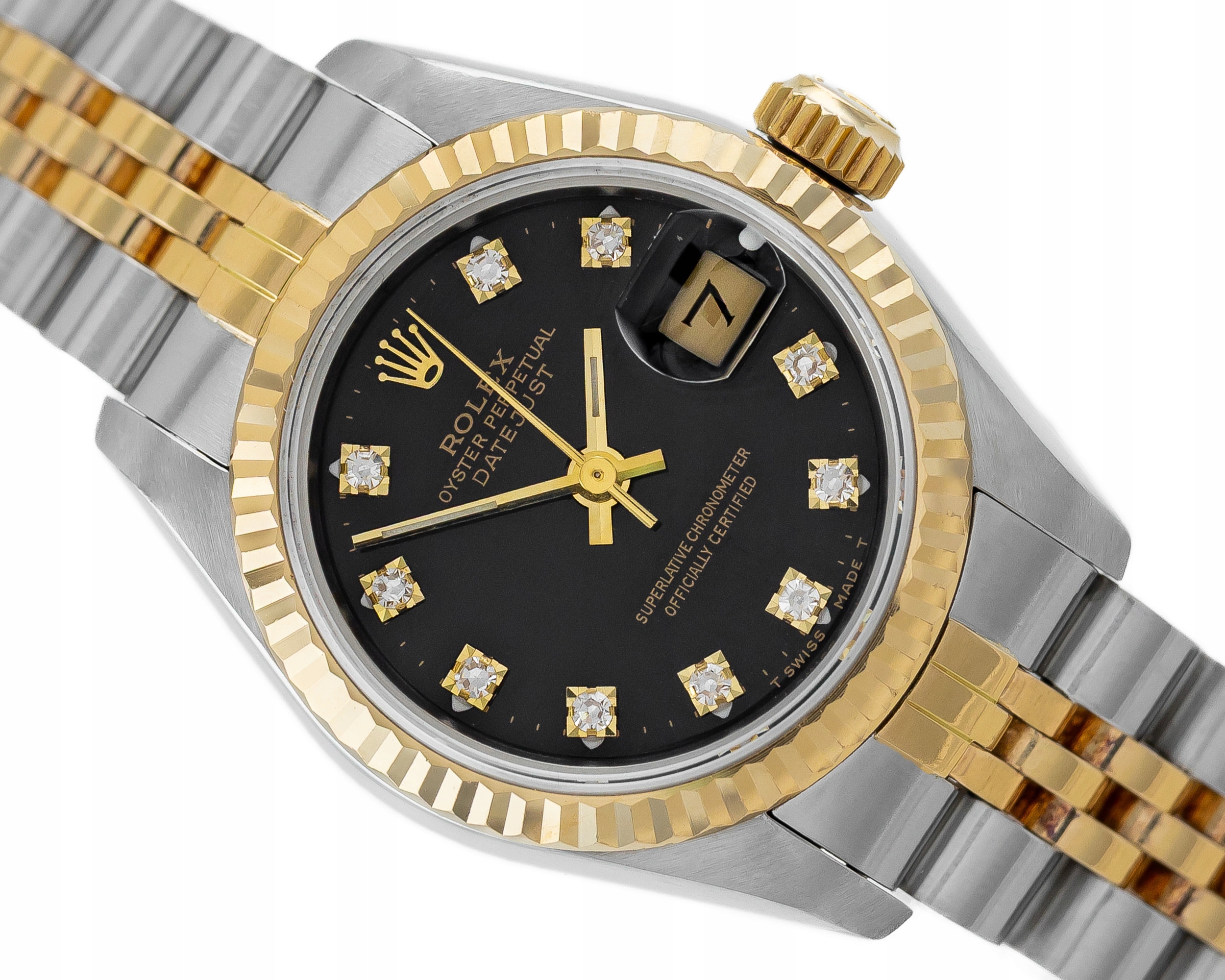 Numer referencyjny: 69173Mechanizm: automatyczny, cal. 2135, 29 kamieni łożyskujących, 40h rezerwy choduObudowa: 26 mm, koperta ze stali, bezel z żółtego złota 18K, czarna tarcza z diamentowymi indeksami, szafirowe szkiełkoWodoszczelność: 10 ATMBransoleta/pasek: Jubilee – stal/żółte złoto 18KZapięcie: pojedynczy zatrzask – stalKomplikacje/funkcje: data, chronometrRok produkcji: 1986Stan: bardzo dobryPłeć: zegarek damskiZawartość dostawy: oryginalne pudełko, komplet dokumentów, firmowa faktura