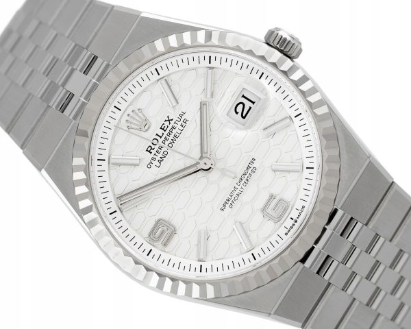 ROLEX LAND-DWELLER 40 FLAT JUBILEE STEEL/WHITE GOLD 18K WHITE HONEYCOMB MOTIF DIAL REF. 127334 FULL SET UNWORN