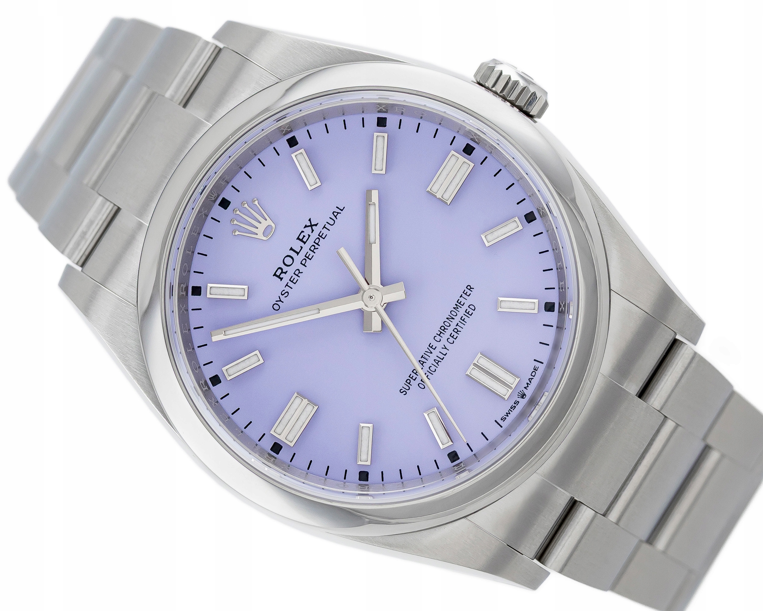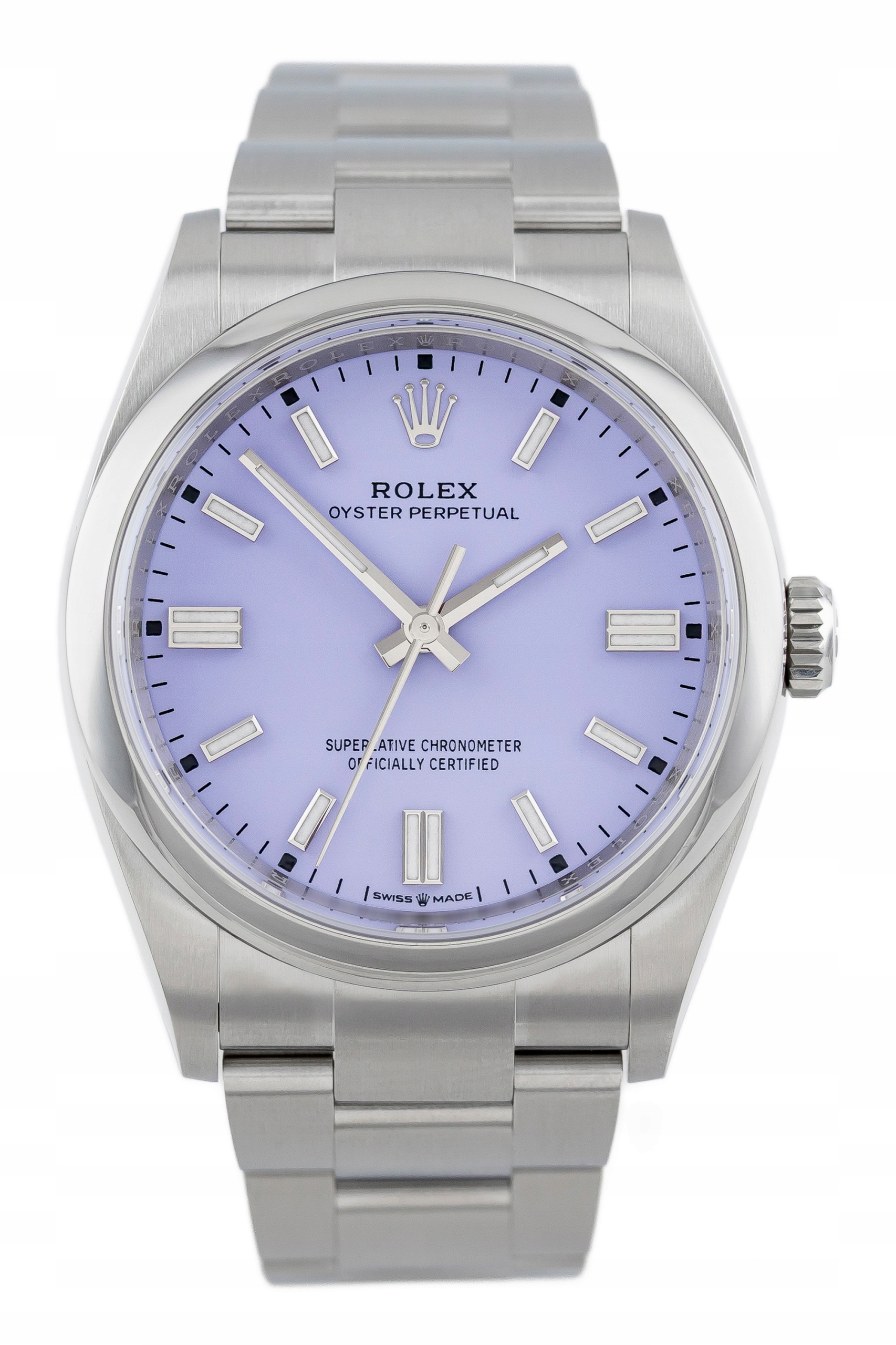 Numer referencyjny: 126000Mechanizm: automatyczny, cal. Rolex 3230, 31 kamieni łożyskujących, 70h rezerwy choduObudowa: 36 mm, koperta i bezel ze stali, lawendowa tarcza, szafirowe szkiełkoWodoszczelność: 10 ATMBransoleta/pasek: stalZapięcie: pojedynczy zatrzask – stalKomplikacje/funkcje: chronometrRok produkcji: 2025Stan: nienoszonyPłeć: zegarek męski/unisexZawartość dostawy: oryginalne pudełko, komplet dokumentów, firmowa faktura