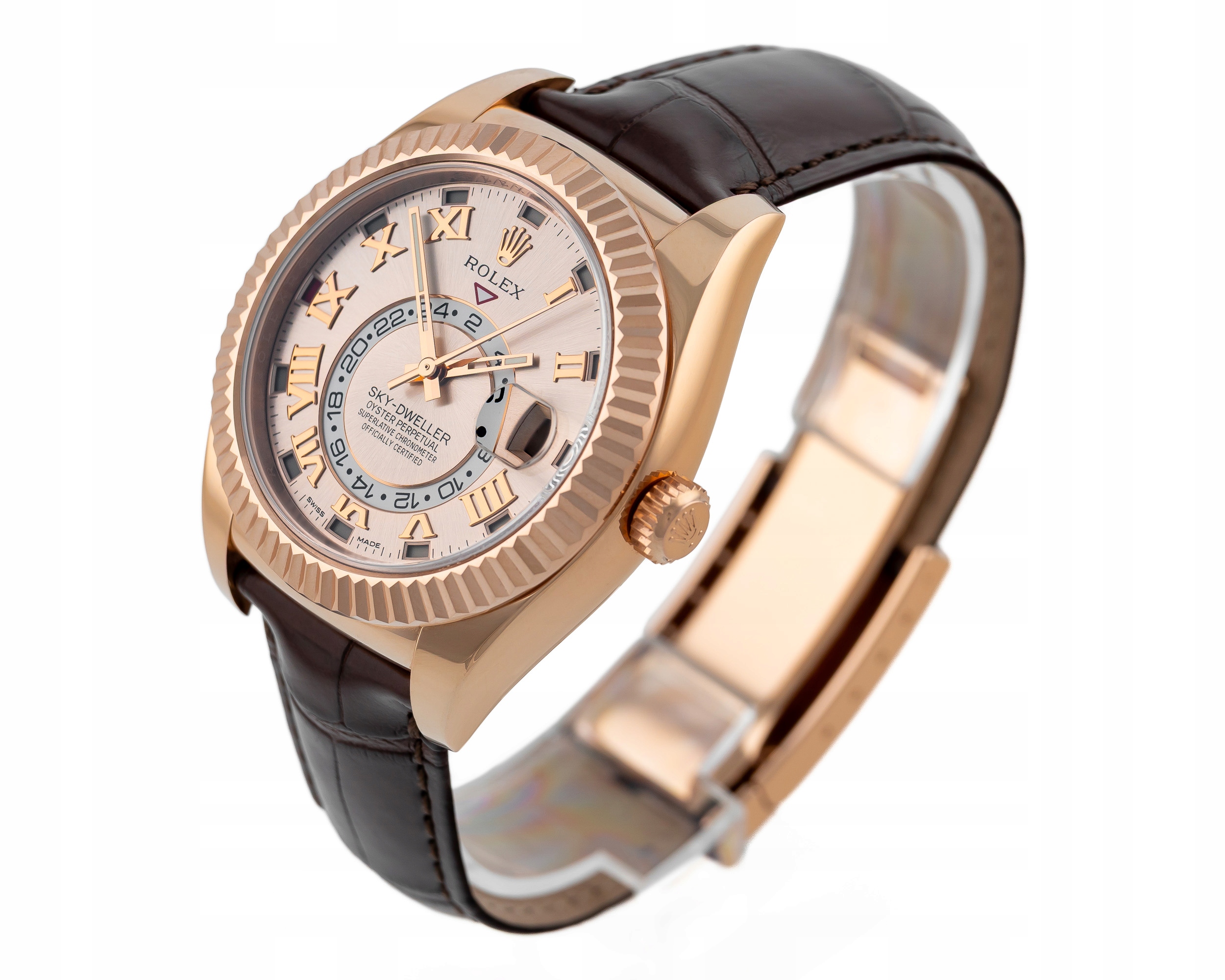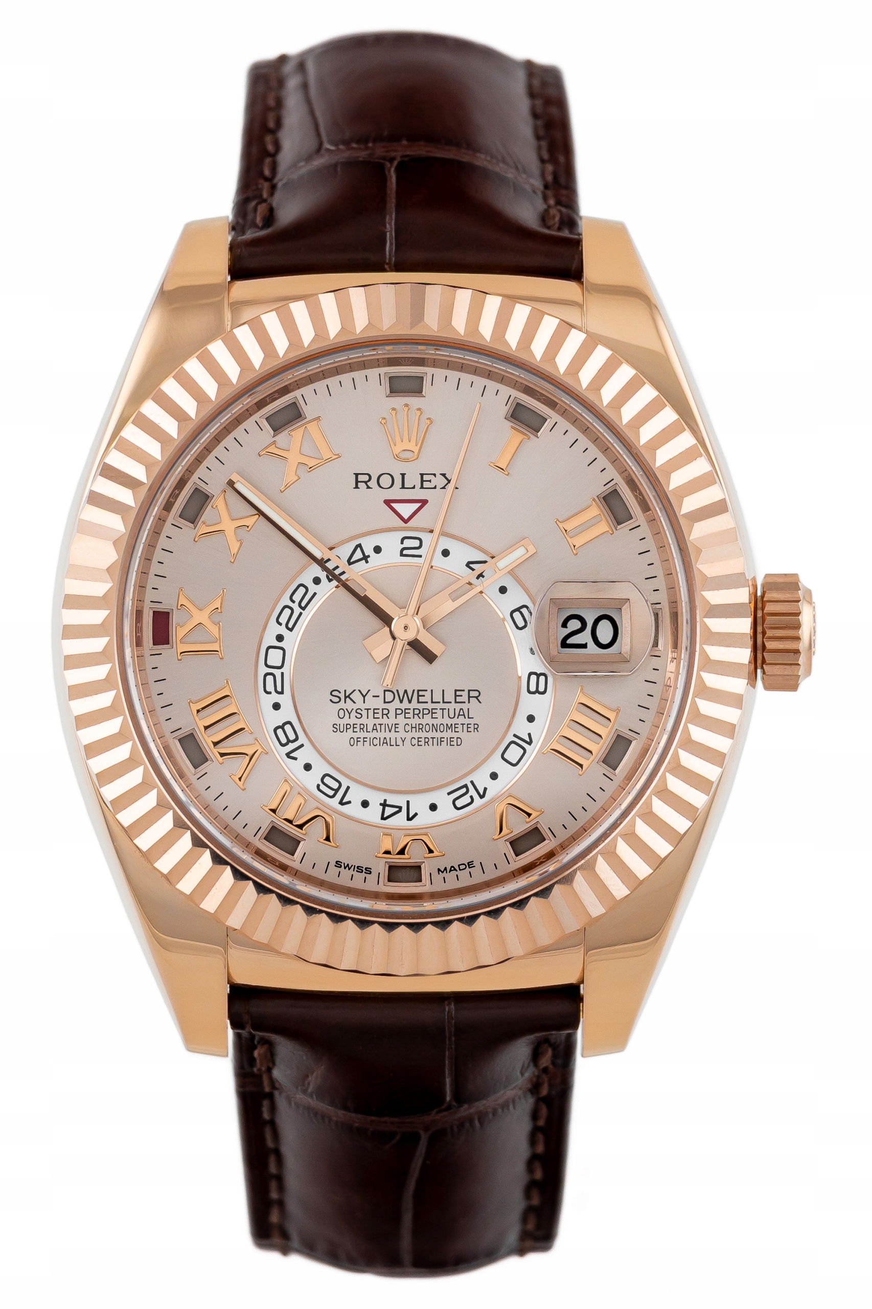Przedmiotem sprzedaży jest przepiękny zegarek manufakturyROLEX SKY-DWELLER ROSE GOLD 18K CHAMPAGNE SUNDUST ROMAN DIAL REF. 326135 FULL SET(zdjęcia autentyczne – przedstawiają sprzedawany egzemplarz)
